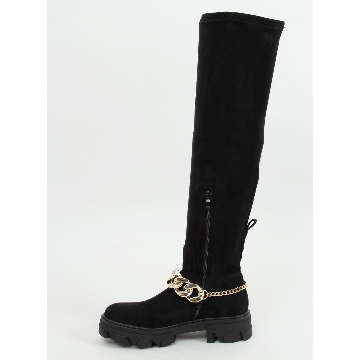 Ein zusätzlicher Vorteil ist die Möglichkeit, zwei Ketten, die sich in einem der Schuhe befinden, unabhängig voneinander zu befestigen, was eine Personalisierung und die Schaffung eines einzigartigen Looks ermöglicht. Die Höhe des Stiefels reicht bis über das Knie, was die Figur perfekt betont und jeder Frau ein sicheres und stilvolles Gefühl verleiht.