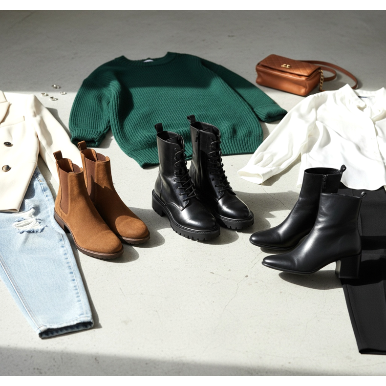Stiefeletten mit Absatz (5–7 cm) sind eine elegante Variante des übergroßen Stils. Mit einer lockeren Boyfriend-Jacke, einem geraden Top und einer Skinny-Hose erzeugen sie einen gewollten Lässigkeitseffekt mit einem Hauch von Chic. Denken Sie an das Kontrastprinzip: Ein lockeres Oberteil erfordert ein etwas definierteres Unterteil.