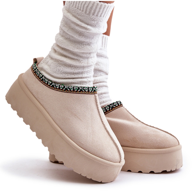 Wir bieten modische Frauenschuhe auf der Plattform in einer leichten Beigefarbe, die eine perfekte Kombination aus Komfort mit den neuesten Trends darstellt. Der obere Teil des Oberen wurde mit einer subtilen Stickerei dekoriert, die ihnen einen einzigartigen, mädchenhaften Charme verleiht. Die massive Plattform, auf der sie widerstehen, garantiert nicht nur eine große Isolation vom kalten Boden, sondern gewährleistet auch die Stabilität bei jedem Schritt.