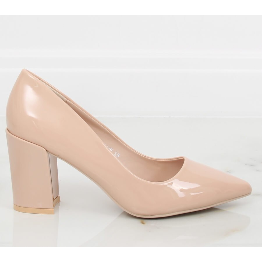 Elegante Frauenpumpen mit einem stabilen Fersentyp mit einer Höhe von 8,5 cm. Der klassische, formell geschnittene mit einer spitzen Nase und lackiertem Finish kombiniert perfekt zeitlose Eleganz mit der täglichen Funktionalität. Hergestellt aus ökologischem Leder in einer universellen Beigefarbe - ideal für die Arbeit, für ein Meeting oder formellere Outputs.