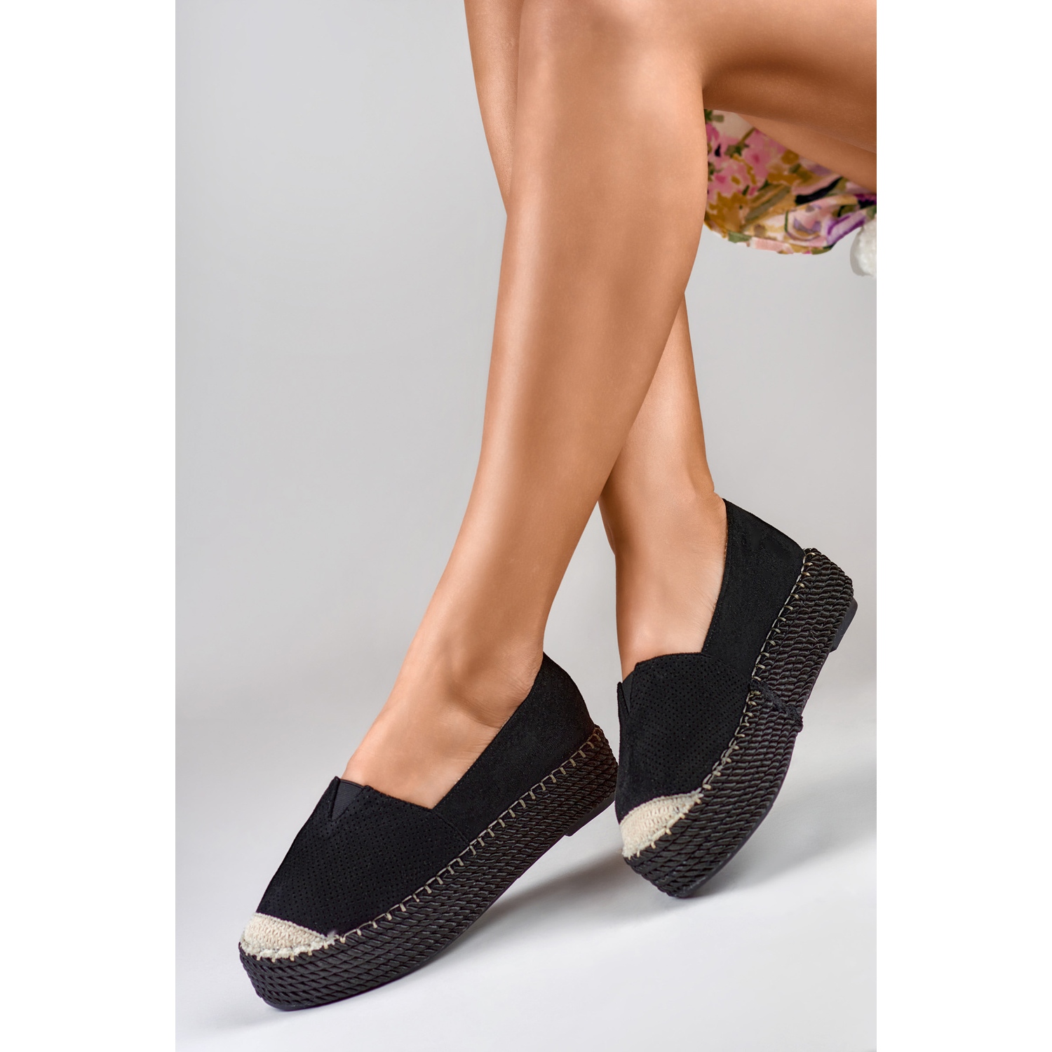 Schwarze Espadrilles zeichnen sich durch eine runde Spitze aus, die für Tragekomfort sorgt, und der Slip-on-Verschluss erleichtert das An- und Ausziehen. Dank des schönen Obermaterials aus Wildleder sehen diese Schuhe äußerst elegant aus und passen durch ihr minimalistisches Design zu vielen verschiedenen Stilen.