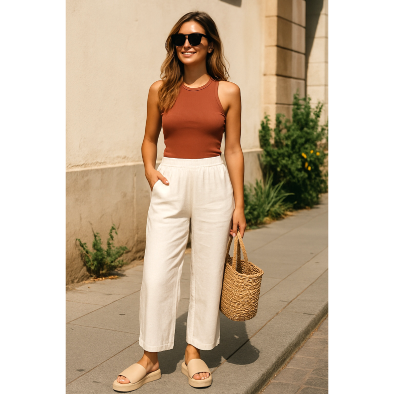 Locker geschnittene Leinenhosen sehen mit Plateauklappen phänomenal aus. Wählen Sie eine weiße oder cremefarbene Hose und kombinieren Sie sie mit einem taillierten Oberteil in einer Kontrastfarbe wie Terrakotta oder Flaschengrün. Fügen Sie eine Korbtasche und eine große Sonnenbrille hinzu. Dieser Stil eignet sich perfekt für das Mittagessen im Restaurantgarten oder für einen Stadtfest im Sommer.