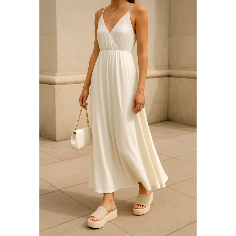 Wählen Sie für ein langes Maxikleid aus zarten, luftigen Materialien Flip-Flops auf mittlerem Plateau in einem gedeckten Farbton. Weiße oder beige Plateauschuhe passen perfekt zu einem hellen, einfarbigen Kleid. Fügen Sie kleinen Goldschmuck und eine kleine Kettentasche hinzu. Dieser Stil eignet sich perfekt für eine Sommerhochzeit im Garten, eine Gartenparty oder eine elegante Party im Freien.