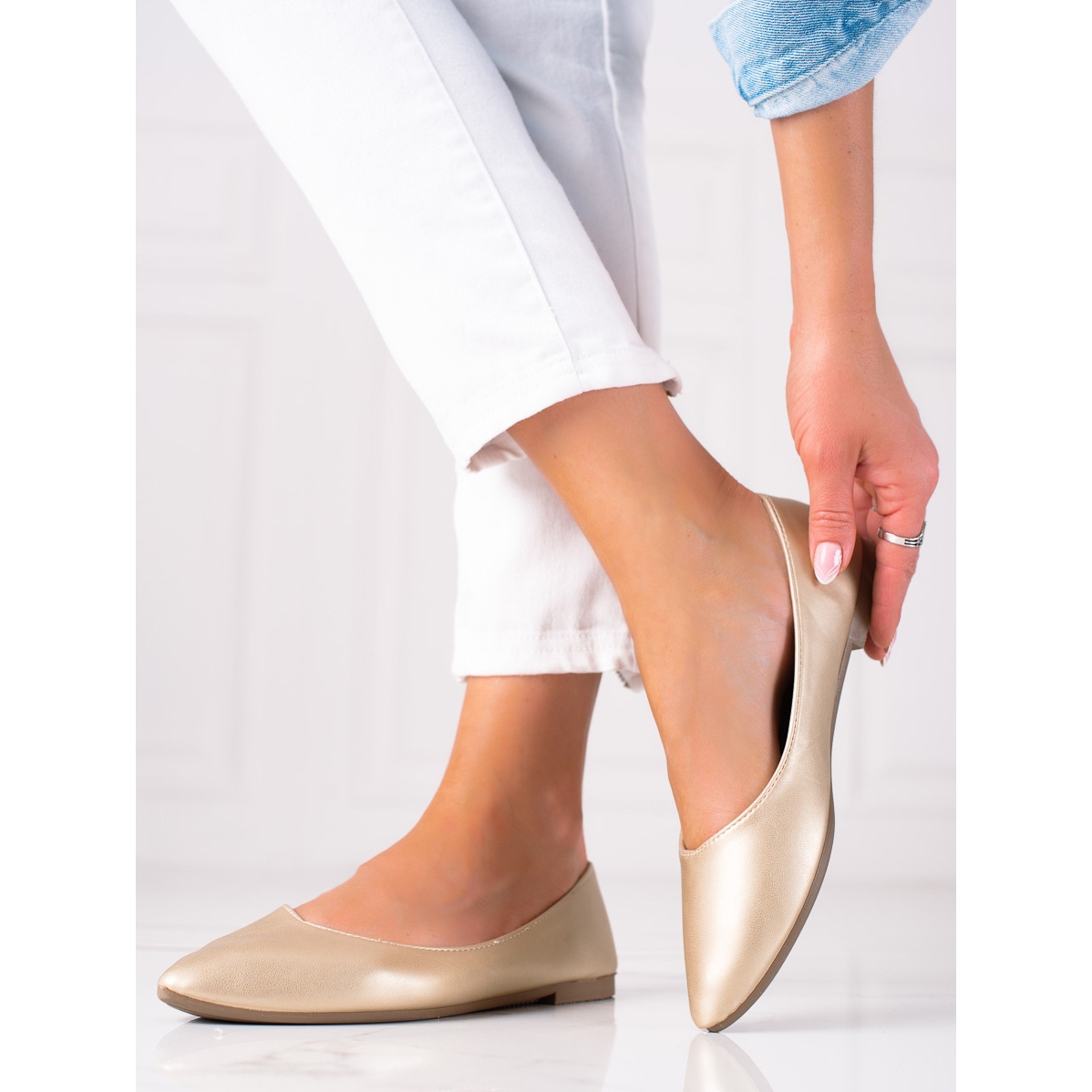 Die aus hochwertigem ökologischem Leder gefertigten Potocki-Ballerinas zeichnen sich durch ihre metallische Goldfarbe aus, die die Blicke auf sich zieht und jedem Styling Glanz verleiht. Ein weicher, eingearbeiteter Absatz sorgt für Stabilität und Tragekomfort, die mandelförmige Spitze sorgt für dezenten Charme. Die Innensohle aus Naturleder garantiert Komfort auch bei ganztägigem Gebrauch.