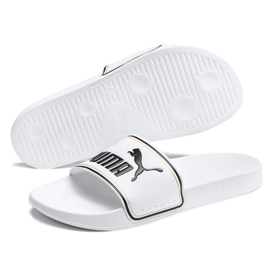 Stylische und komfortable Frauenklappen Puma Leadcat Ftr in universellen, weißen Farben. Perfekt für den Strand, für städtische Stile nach dem Training und jeden Tag. Ein einfacher Schnitt mit einem breiten, sanft gepolsterten Streifen bietet Komfort des Gebrauchs, und die leichte Sohle aus EVA -Schaum absorbiert jeden Schritt.