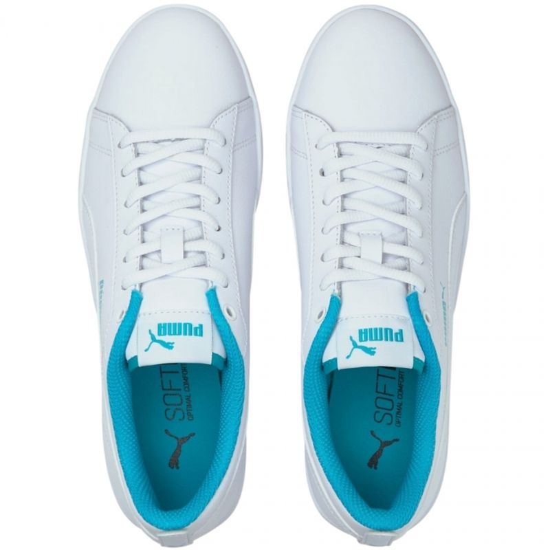 Wir präsentieren Damenschuhe Puma Smash Wns v2 W 365208 27, perfekt für den täglichen Gebrauch, die modisches Design und Komfort vereinen. Diese weiß-blauen Sneaker wurden für Frauen entworfen, die sowohl Wert auf Stil als auch auf Komfort legen.