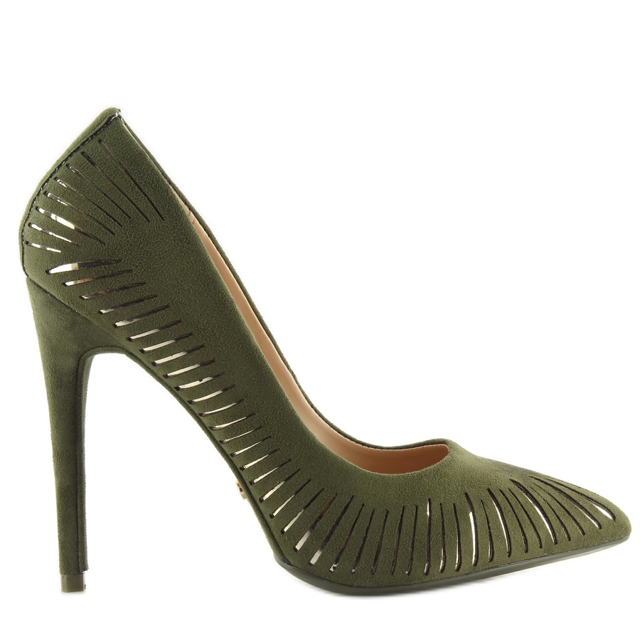 Entdecken Sie die Eleganz und den einzigartigen Stil der LE016P Olive-Pumps mit hohen Absätzen in einem herrlichen Grünton. Diese einzigartigen Damenschuhe mit schmalem 11 cm hohem Absatz vereinen modernes Design und Tragekomfort. Die aus ökologischem Wildleder gefertigten Pumps fallen durch durchbrochene Ausschnitte und glänzende Silberakzente auf, was ihnen Originalität verleiht.