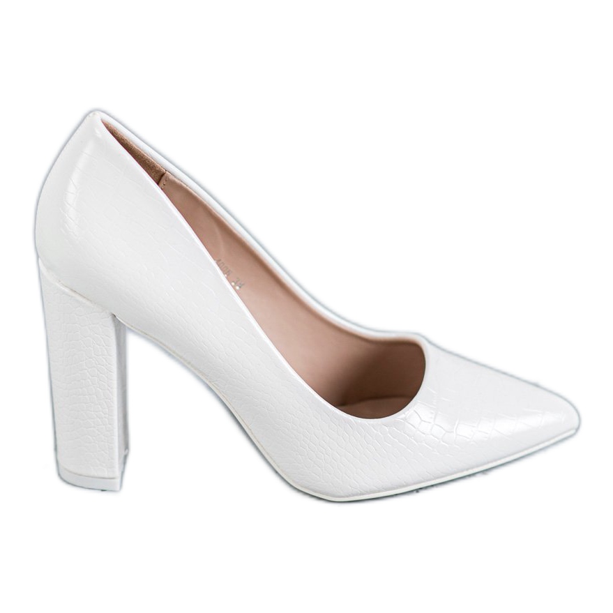 Wir präsentieren weiße Pumps mit hohen Absätzen der Marke Diamantique, die einen klassischen Schnitt mit einem modernen Stil kombinieren. Diese eleganten Damenschuhe sind aus hochwertigem, kunstlederähnlichem Material gefertigt, das die zarte Textur von Schlangenhaut imitiert und dem Ganzen einen einzigartigen Charakter verleiht.