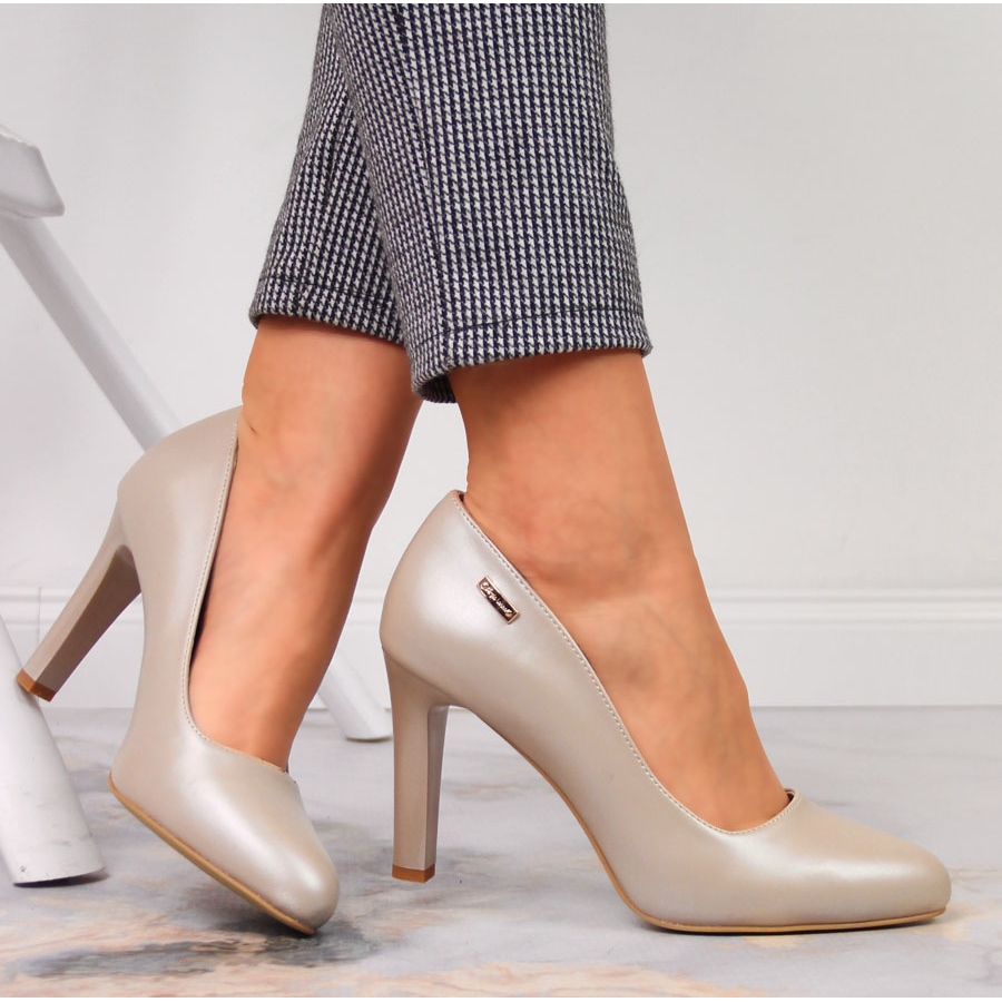 Perlpumpen Sergio Leone in einem nackten Farbton sind eine Kombination aus Stil und Komfort. Ein glattes oberes oberes oberes ökologisches Leder mit einem zarten, Perlenfinish verleiht den Schuhen ein subtiles Leuchten, dank der sie sowohl in formellen als auch in ungezwungenen Stylisationen großartig sind. Eine klassische, runde Nase und ein stabiler Pfosten mit einer Höhe von 9 cm sorgen für einen eleganten Look, während der Komfort des Gehens aufrechterhalten wird. Der natürliche Ledereinsatz kümmert sich um Belüftung und Weichheit beim Gebrauch.