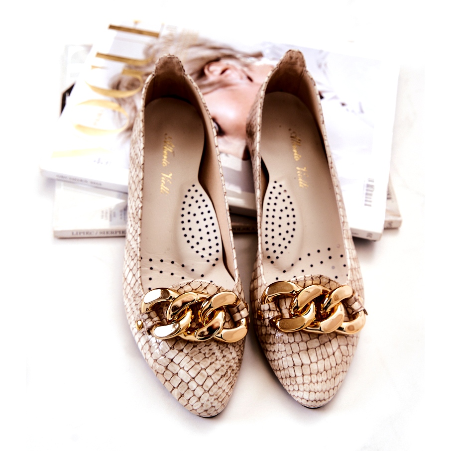 Der Innenbereich der Schuhe ist mit einer weichen Lederdecksohle versehen, die zusätzlich profiliert und perforiert ist, was für ausreichende Belüftung sorgt und sich der Fußform anpasst. Ein einzigartiges Detail der Pumps ist eine elegante Kette, die Eleganz verleiht und ihre Originalität unterstreicht.