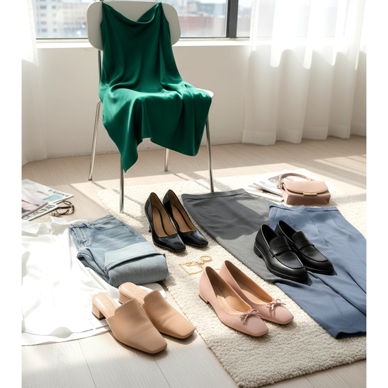 Für das Büro: Kombinieren Sie Ballerinas oder Slipper mit eckigen Zehen zu einem Bleistiftrock oder einer Zigarettenhose. Dieses Set ist die Quintessenz des professionellen Powerlogs von 2026. Wählen Sie eine Schuhfarbe ähnlich der Unterseite Ihres Outfits, um Ihre Beine optisch zu verlängern.