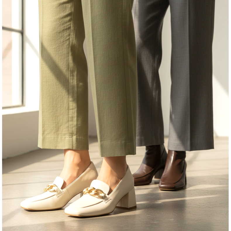 Da Schuhe mit quadratischer Spitze eine geometrische, klare Form haben, sollten Sie bedenken, dass die Hose dieses charakteristische Element nicht verdeckt. Die optimale Beinlänge endet knapp über dem Schuh oder überlappt ihn leicht – zu lange Beine verdecken eine quadratische Spitze und eliminieren den Dehnungseffekt.
