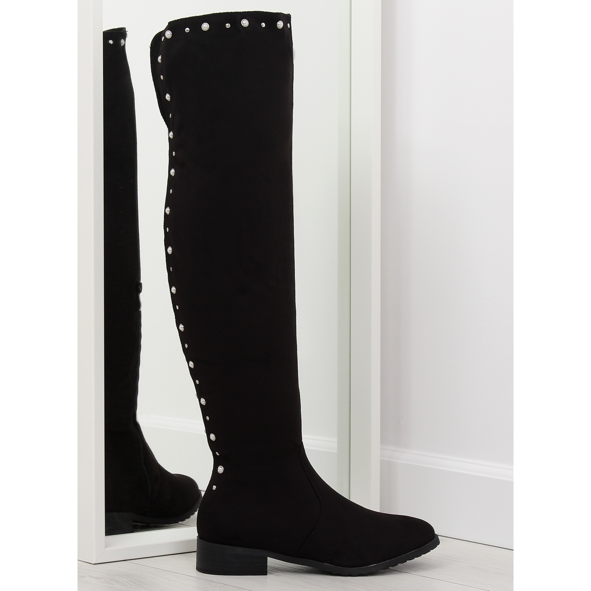 Elegante, flach -heftige Frauen -Musketiere (3 cm), bestehend aus ökologischem Wildleder in einer klassischen schwarzen Farbe. Das obere Knie wurde mit Perlen und silbernen Strasssteinen verziert - modische, subtile Dekorationen verleihen den Schuhen den Charakter. Das Tragen von Komfort garantiert ein Seitenschloss und eine weiche Pelzisolierung im Inneren. Eine einzige aus Synthetik hergestellte runde Nase.