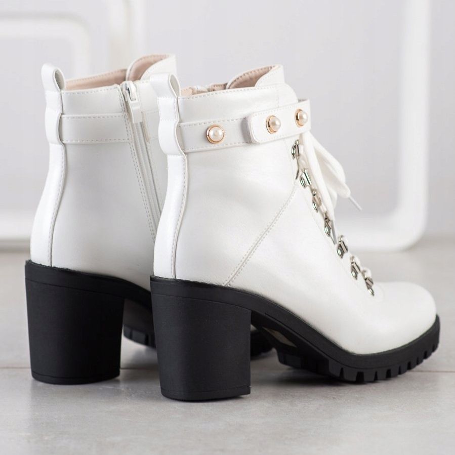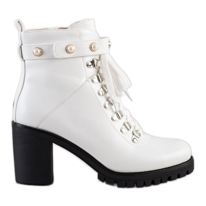 Wir präsentieren einzigartige Damen-Stiefeletten im rockigen Stil, die mit Sicherheit die Blicke jeder Modeliebhaberin auf sich ziehen. Das Modell Ideal Shoes zeichnet sich durch ein Oberteil aus hochwertigem Lederimitatmaterial in eleganter weißer Farbe aus. Im Gegensatz dazu verleihen eine schwarze Profilsohle und ein solider, 8 Zentimeter breiter Absatz den Schuhen Charakter und Stabilität.
