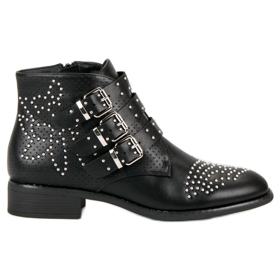 Die Stiefel zeichnen sich durch Strasssteine und ein durchbrochenes Muster aus, die ihnen einen rockigen Charakter verleihen, und drei helle Schnallen sorgen für Modernität und Eleganz. Mit einer Absatzhöhe von 3,5 cm und einer flachen Spitze sind diese Stiefeletten den ganzen Tag über bequem zu tragen.