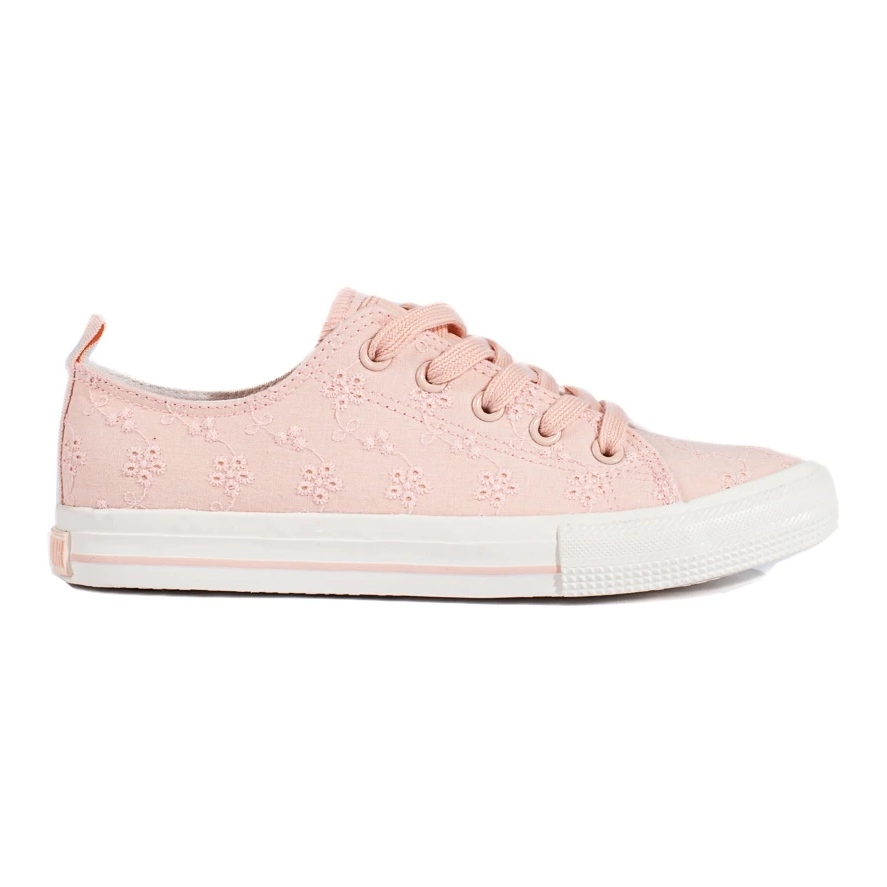 Delikate, feminine Sneakers Big Star LL274224 in einem hellrosa Farbton (L.Pink) ist täglich ein idealer Vorschlag. Das obere, das ausschließlich aus Textilien hergestellt wurde, ist mit einem subtilen Blumenmuster und einer Spitze dekoriert, dank der klassische Sportschnitte erhält ein romantischer Charakter. Die niedrige Plattform von 2,5 cm und die sanft gebaute Ferse bieten den ganzen Tag aus Komfort.