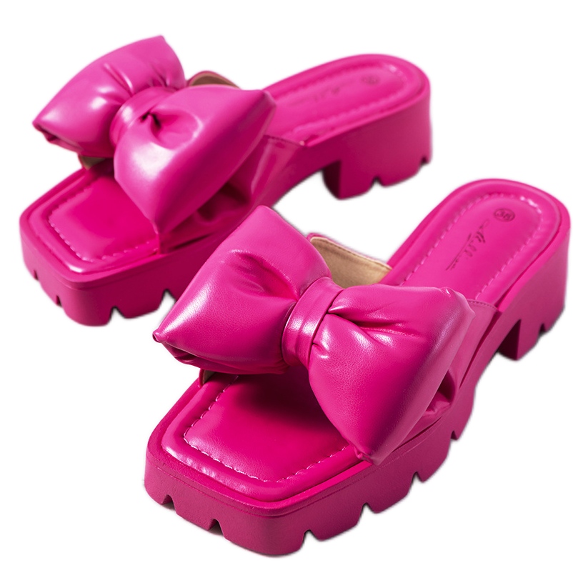 Details: Rosa Pantoffeln auf der Platt-Traktorsohle