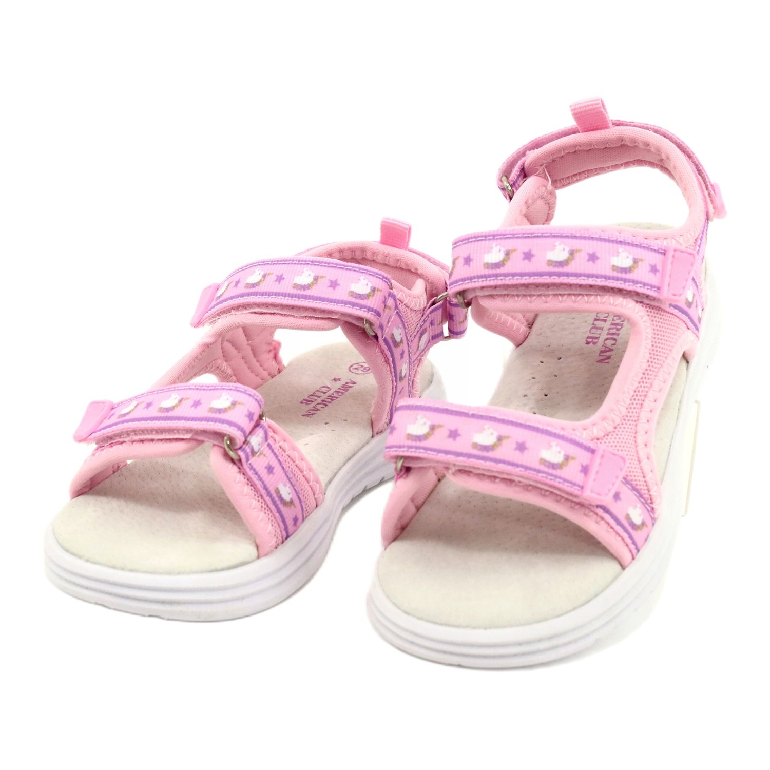 Pink Sandals American Club RL39 - charmante und komfortable Schuhe für ein wenig elegantka. Eine subtile Kombination aus rosa und lila und dekorativen Elementen mit einem Einhornmotiv auf Streifen macht jede Ausgabe einzigartig. Es ist die perfekte Wahl für ein Mädchen, das sich gerne modisch präsentiert.