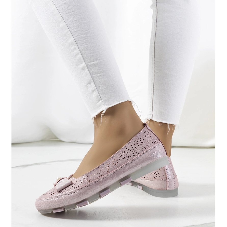Elegante Catania -Slipper aus hochwertigem natürlichen Wildlederleder in einem weiblichen, rosa Schatten. Das Obermaterial wurde mit einem zarten offenen Arbeitsmuster und glänzenden Partikeln dekoriert, und der dekorative Bogen sorgt für einen ganzen Charme. Ein weicher, profilierter natürlicher Ledereinsatz bietet selbst bei langen Verschleißkomfort. Eine graue Gummi -Sohle garantiert eine gute Haftung und Leichtigkeit. Das Modell mit niedrigem Schnitt ist perfekt für warme Tage - Sommersammlung.