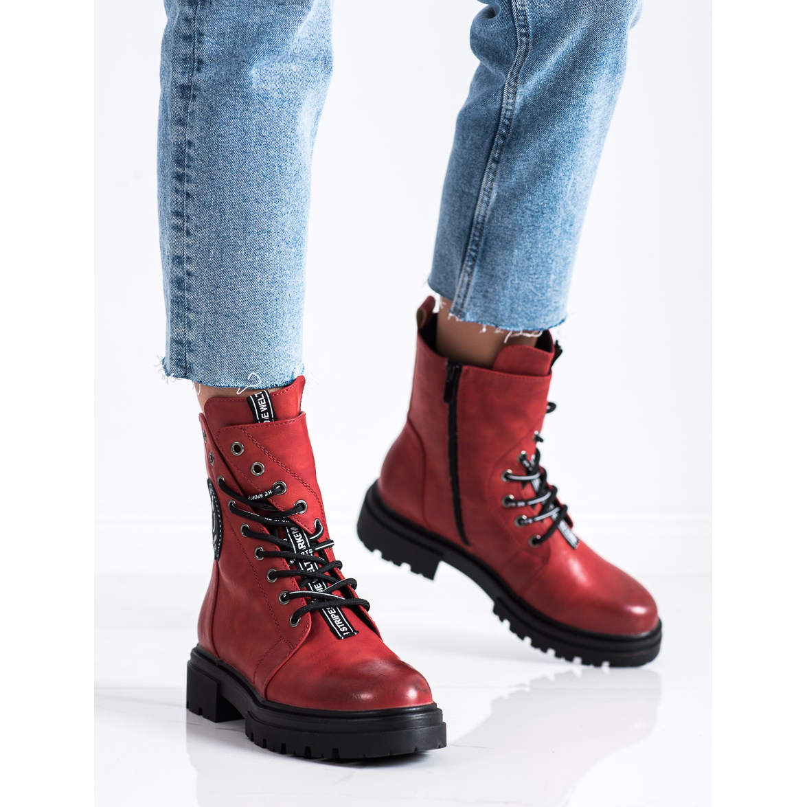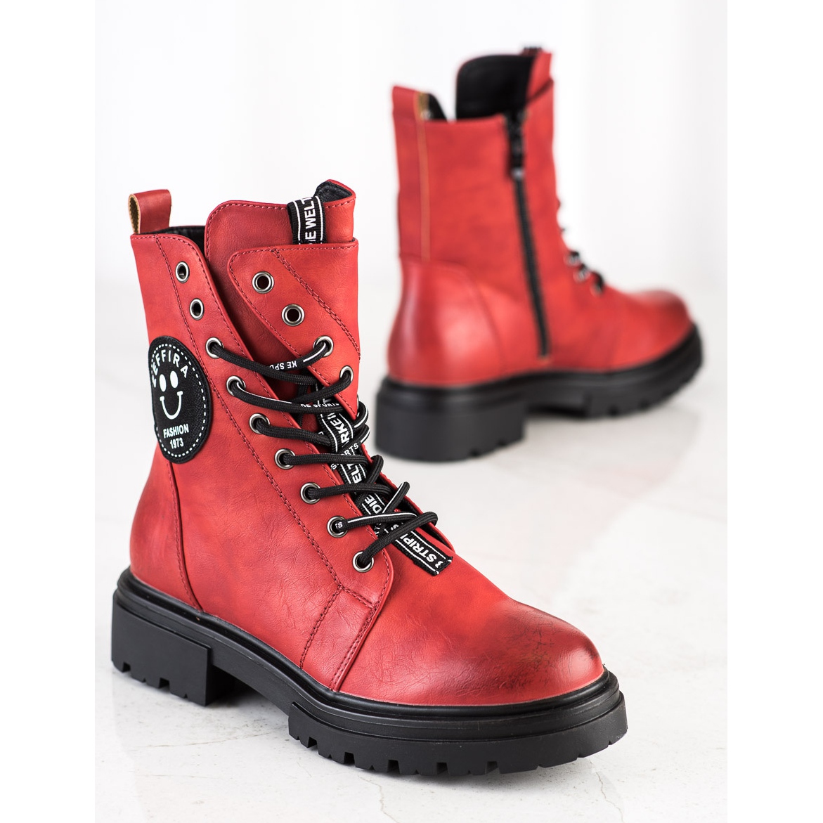 Lernen Sie die roten Evento-Worker kennen, die perfekt zu den Trends des Casual- und Rock-Stils passen. Diese äußerst eindrucksvollen Stiefeletten sind aus hochwertigem Faux-Wildleder gefertigt, was sie sowohl stilvoll als auch umweltfreundlich macht. Ihre charakteristische rote Farbe wird mit Sicherheit die Aufmerksamkeit auf sich ziehen und jedem Styling Charakter verleihen.