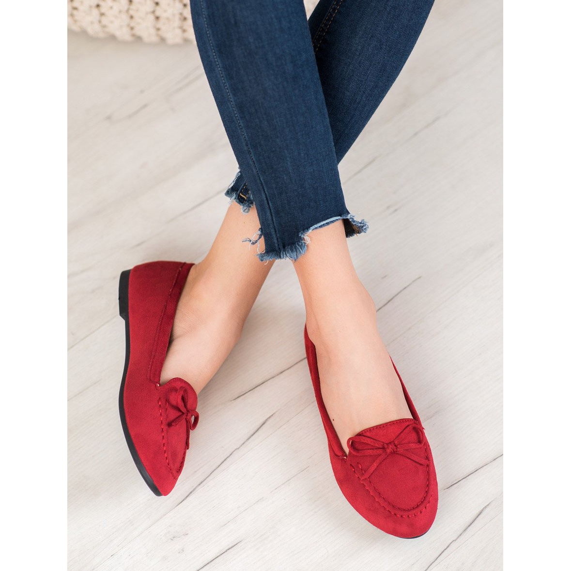 Das Obermaterial aus hochwertigem ökologischem Wildleder in saftigem Rot zieht die Blicke auf sich und Ziernähte auf der Vorderseite sorgen für Chic. Die Zehenpartie ist stark gerundet, was für ein angenehmes Tragegefühl sorgt, und eine oben angebrachte, zarte Schleife verleiht den Schuhen einen besonderen Charme.