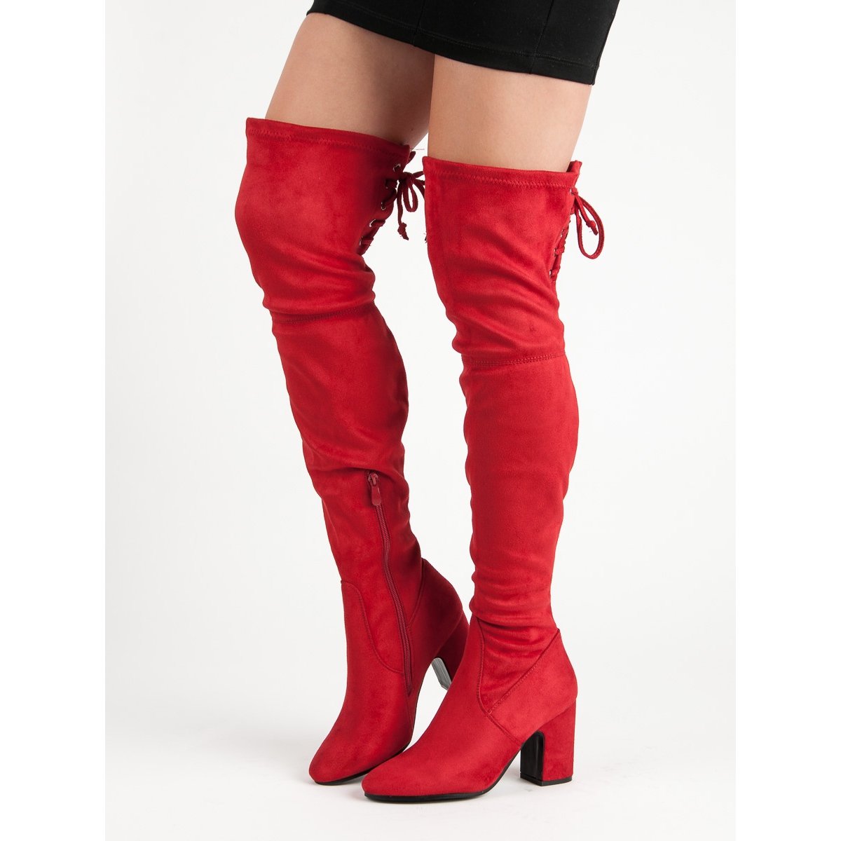 Details: Super Me Rote oberschenkelhohe Stiefel an einem Pfosten