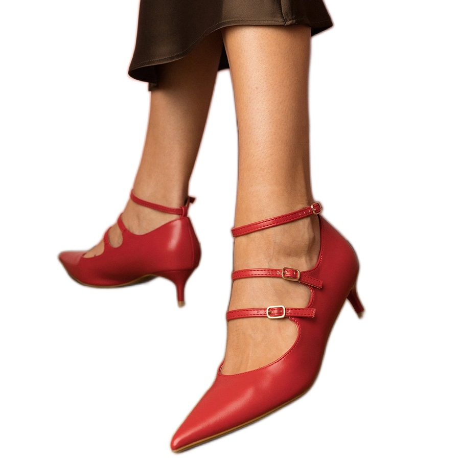 Rote Pumpen auf einem niedrigen Stapel mit Schnallen sind die perfekte Wahl für Frauen, die ihre Garderobe mit einem eleganten Akzent bereichern möchten. Diese stilvollen Schuhe sind eine Kombination von Klassikern mit modernem Design, perfekt für besondere Anlässe und für alltägliche Outfits.