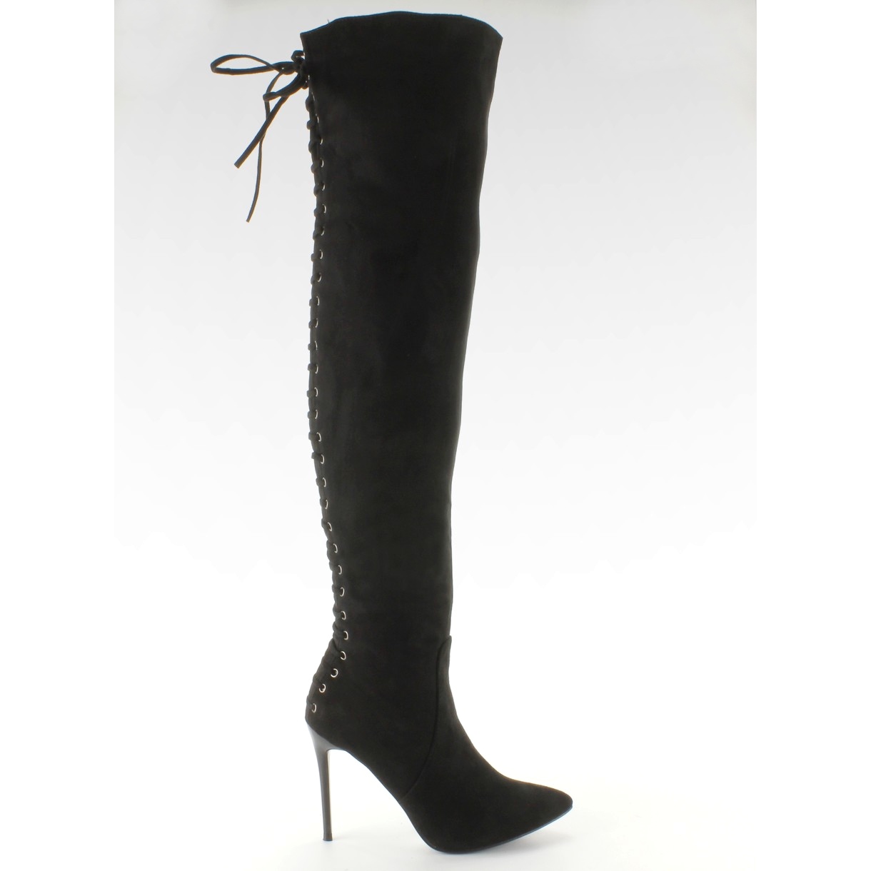 SY-12 Schwarze Overknee-Stiefel – sinnliche Overknee-Stiefel, die jedem Styling einen ausgeprägten, femininen Charakter verleihen. Ein schlanker, 10,5 cm hoher Stiletto-Absatz verlängert die Silhouette und die dekorative Schnürung auf der Rückseite sorgt für Koketterie (die Schnürung ist dekorativ und dient nicht der Anpassung des Umfangs).