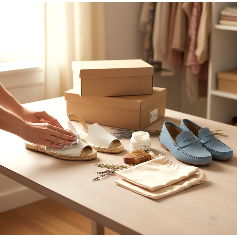 Bevor Sie Ihre Sommerschuhe für die Saison einlagern, stellen Sie sicher, dass sie sauber und trocken sind. Jede Spur von Schmutz oder Schweiß kann zu bleibenden Flecken oder Gerüchen führen. Wischen Sie sie mit einem sauberen Tuch ab und lassen Sie sie vollständig trocknen. Wenn Ihre Schuhe aus Wildleder oder Leder sind, tragen Sie eine Schutzlotion auf. Denken Sie daran, sie an einem kühlen, trockenen Ort aufzubewahren – niemals in der prallen Sonne, die die Schuhe verfärben kann. Bewahren Sie sie nach Möglichkeit in Kartons oder Stoffbeuteln auf, um sie vor Staub zu schützen.