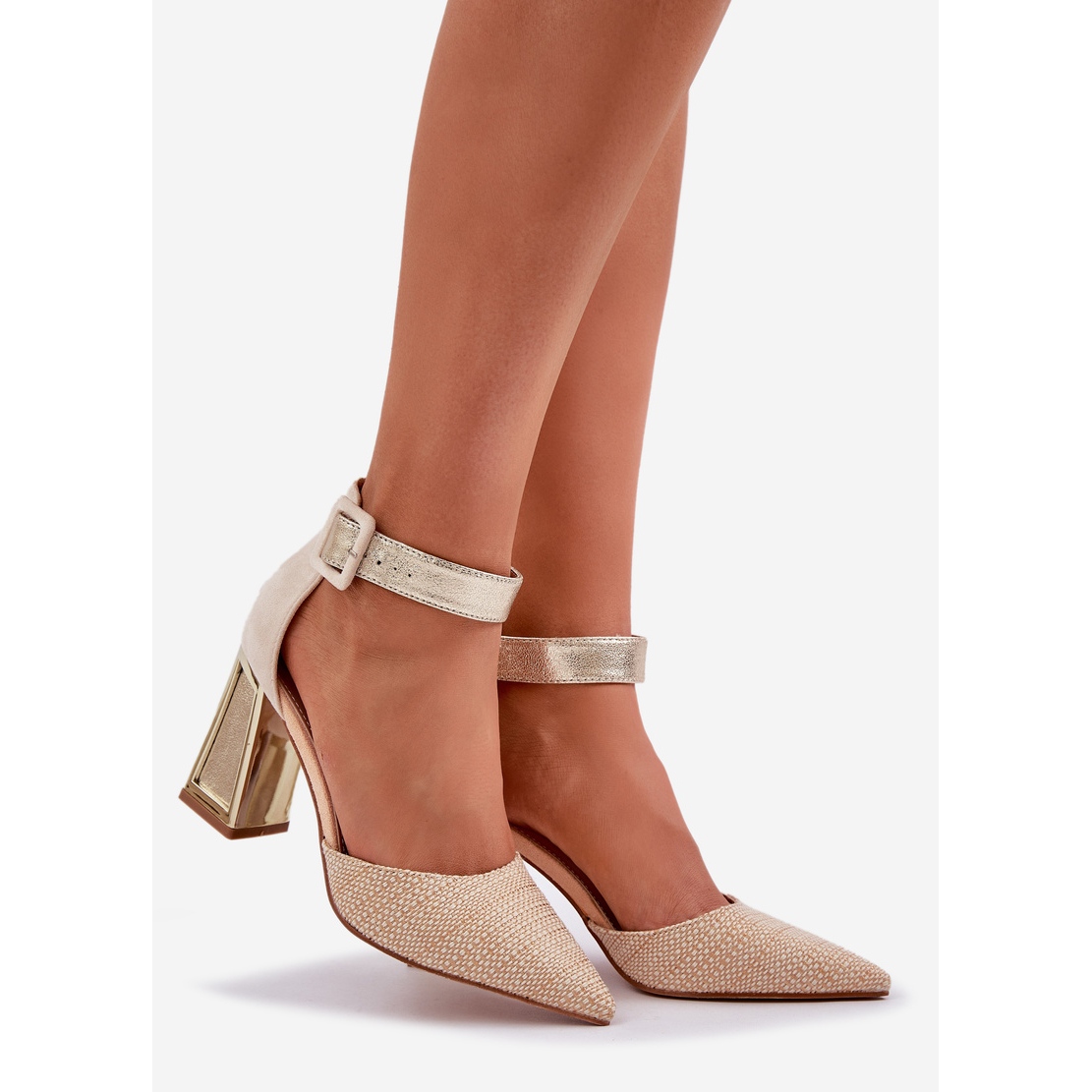 Sandalen auf einem Pfosten mit spitzen Zehen in einer schönen goldenen Farbe sind ein idealer Ansprechen für Frauen, die ihre Einzigartigkeit und ihren Stil hervorheben wollen. Sie bestehen aus Öko -Wildleder und erfreuen sich mit einem modernen Look und einem eleganten Finish. Eine 9 -cm -Hochferse mit einer Spiegelhöhe mit einem Spiegel und goldenen Details verleiht ihnen ein einzigartiges Leuchten, wodurch jede Stilisierung Ausdruckskraft erhält.