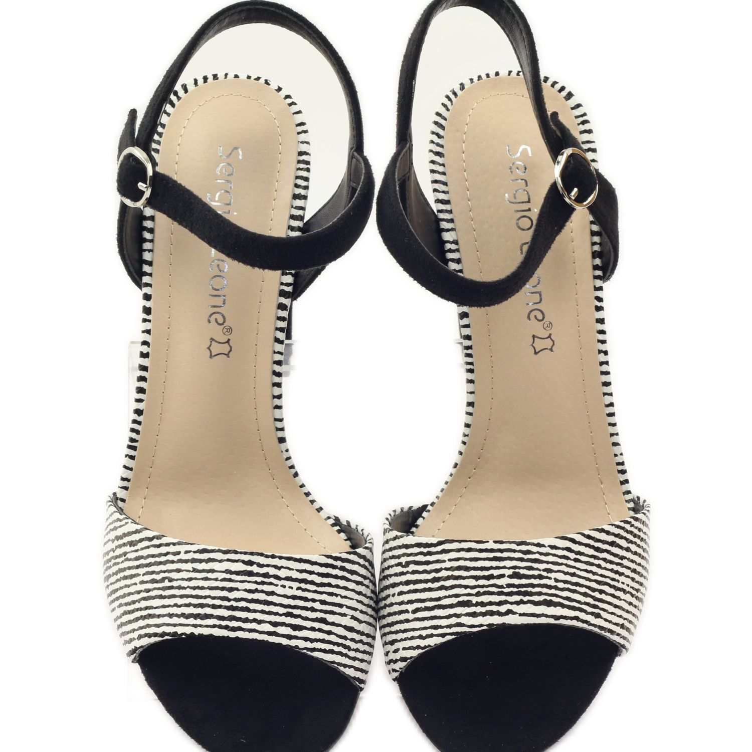 Die weiß-schwarz gestreiften Sandaletten Sergio Leone 820 mit hohen Absätzen sind eine ideale Wahl für Frauen, die die Kombination aus Eleganz und Komfort schätzen. Diese einzigartigen Sandalen zeichnen sich nicht nur durch ihr modisches Design aus, sondern auch durch die sorgfältige Verarbeitung aus hochwertigem Faux-Wildleder, die die Langlebigkeit des Produkts gewährleistet.