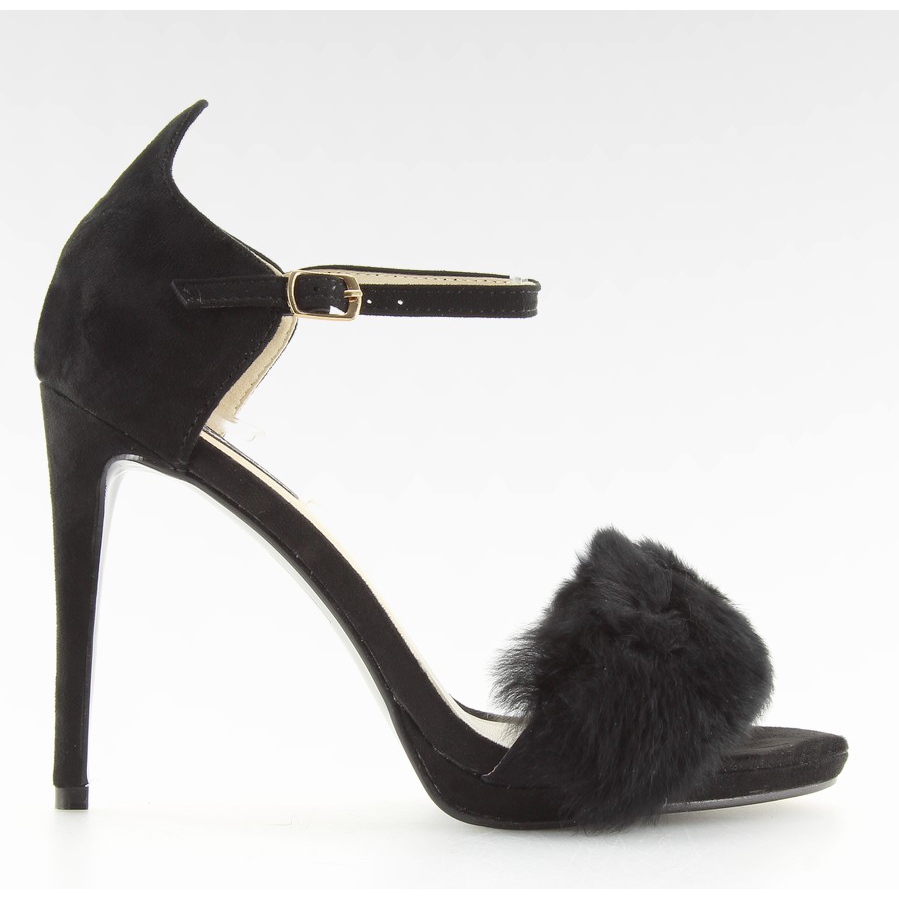 Elegante schwarze Sandalen mit schmalem 11 cm hohem Absatz. Ein breiter, mit flauschigem Fell verzierter Riemen verleiht Sinnlichkeit und einen einzigartigen Charakter, und ein Riemen mit Schnalle am Knöchel stabilisiert den Schuh und sorgt für sicheren Halt am Fuß. Das Modell besteht aus ökologischem Wildleder, die Innensohle ist ebenfalls aus ökologischem Leder. Die offene Spitze betont die feminine Silhouette des Fußes – perfekt für Abende und besondere Anlässe.