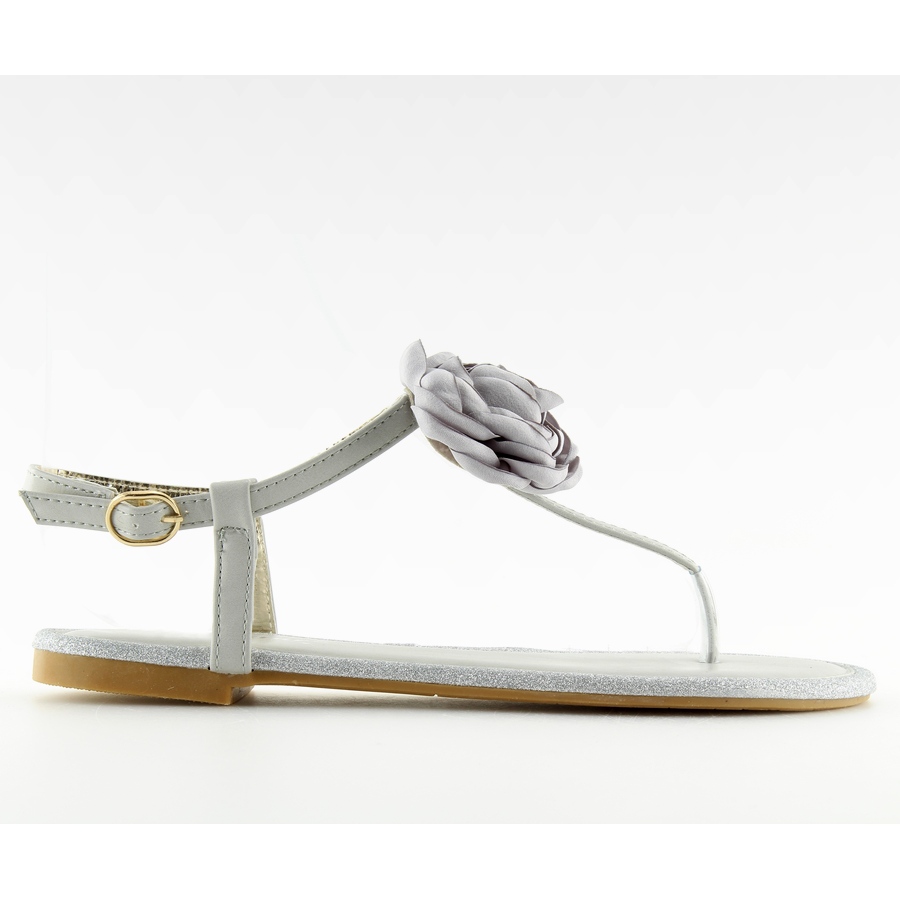 zehenstegsandalen-Sandalen mit Blume T314P Grau – zart, romantisch und außergewöhnlich feminin. Der Grauton in Kombination mit floralem Dekor und dezentem Glitzerstaub auf der Borte sorgt für einen leichten, eleganten Effekt, perfekt für Sommer und Frühling. Das klassische zehenstegsandalen-Design mit verstellbarer Schnalle sorgt für Komfort und sicheren Sitz.