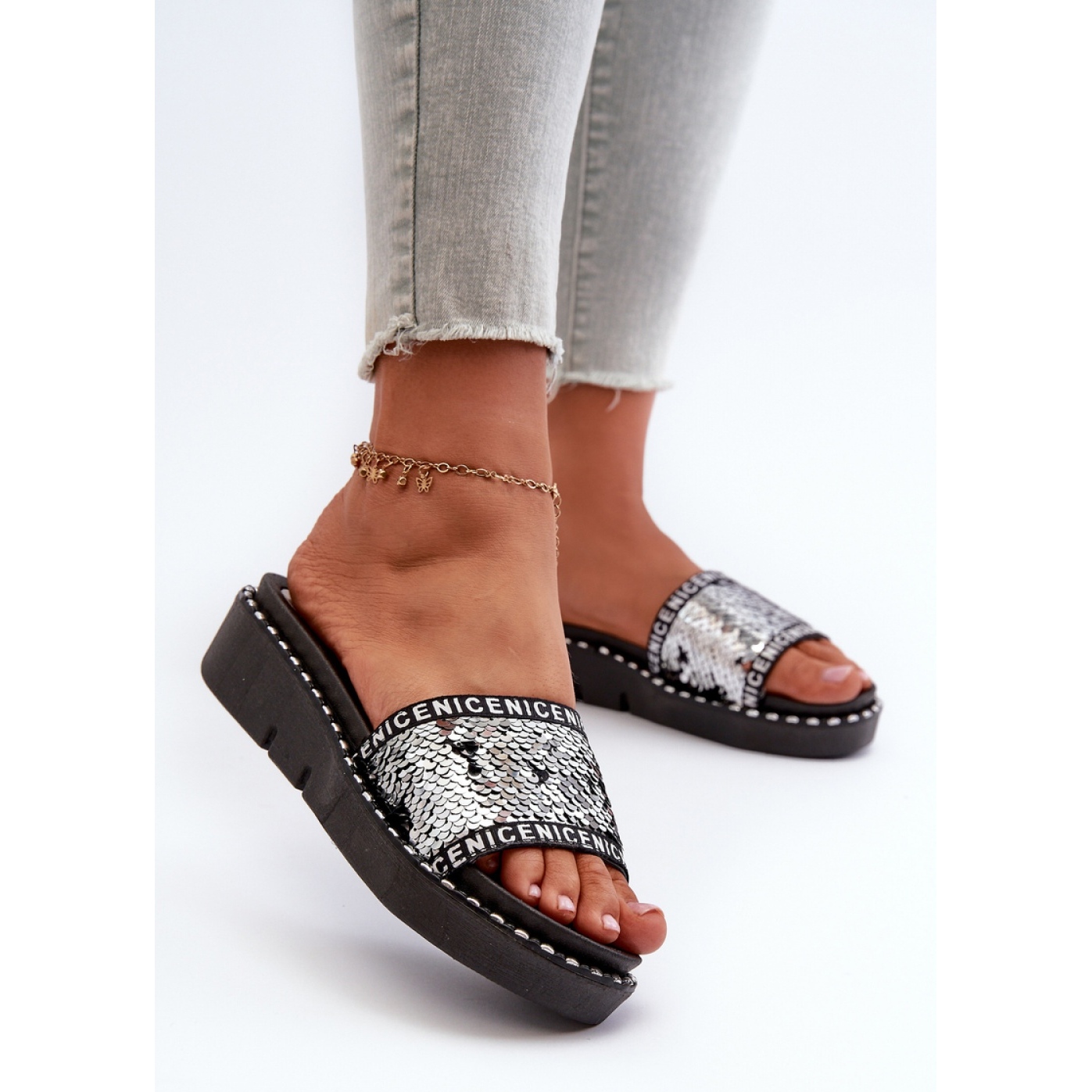 Rivanique Flip -Flops, die mit Pailletten und einer stilvollen Inschrift dekoriert sind, fangen jeden Blick auf jeden Blick auf. Sie bestehen aus hochwertigem Plastik und sorgen für die Verwendung von Haltbarkeit und Leichtigkeit, und der Schaumstoffeinsatz garantiert den maximalen Tragenkomfort auch den ganzen Tag.