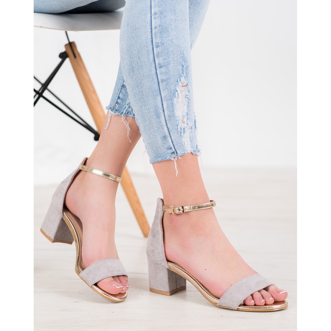 Die Schuhe haben einen stabilen 6-Zentimeter-Blockabsatz, der für Tragekomfort sorgt, perfekt für lange Abende oder Feiern. Das Obermaterial mit eingearbeitetem Absatz und einem Wildlederriemen über den Zehen unterstreicht den eleganten Stil der Sandalen. Zusätzlich ist der Absatz mit einem goldenen Riemen mit eleganter Schnalle verziert, was ihnen einen einzigartigen Charakter verleiht.