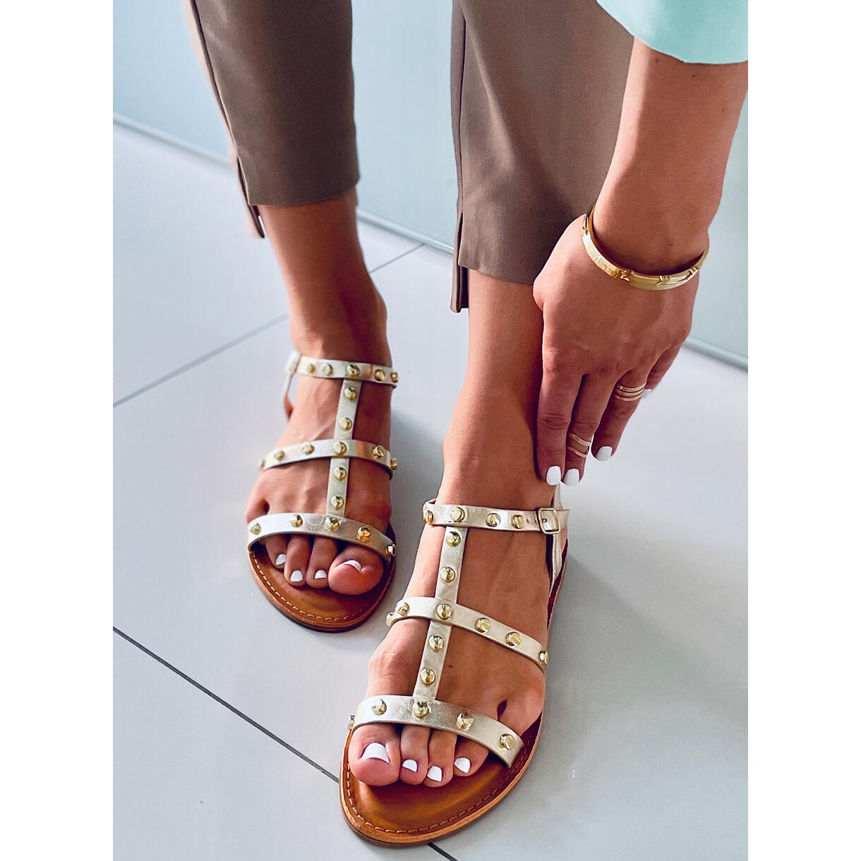 Entdecken Sie sommerliche Eleganz mit Neha Gold Sandalen in einer spektakulären Goldfarbe! Diese flachen Damensandalen sind die perfekte Ergänzung für jedes Urlaubs-Styling. Ihr metallisches Finish wird Ihre Bräune perfekt hervorheben und die ausdrucksstarken Nieten verleihen jedem Schritt Charakter.