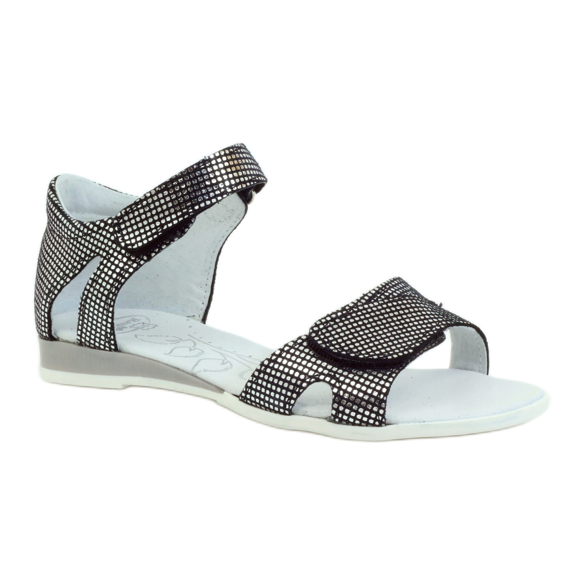 Mit Klettverschluss befestigte Schuhe garantieren ein schnelles und einfaches Anziehen, was sowohl Kinder als auch ihre Eltern sicherlich zu schätzen wissen. Die Sandalen sind mit einer steifen Fersenkappe ausgestattet, die den Fuß stabilisiert, und die profilierte Innensohle aus Naturleder, veredelt mit Silberionen, erhöht den Tragekomfort, indem sie die Entstehung von Mikroorganismen und unangenehmen Gerüchen verhindert.