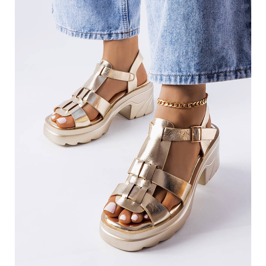 Das Design der Sandalen fällt durch den 7 cm hohen Blockabsatz auf, der Stabilität und Chic vereint. Der metallische Glanz, ein zusätzliches Feature, hebt die goldene Oberfläche des Sunset-Modells hervor, verleiht Glanz und erregt Aufmerksamkeit. Der klassische Schnitt liegt immer im Trend und die quadratische Spitze sorgt für Komfort und gibt den Fingern Platz.