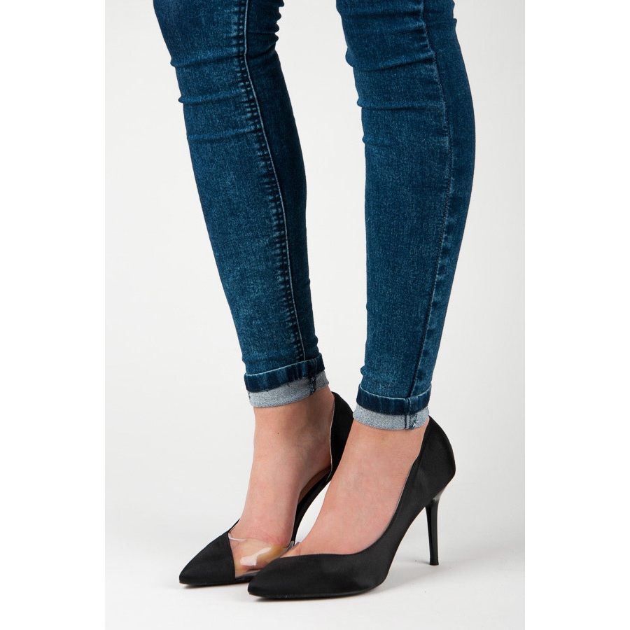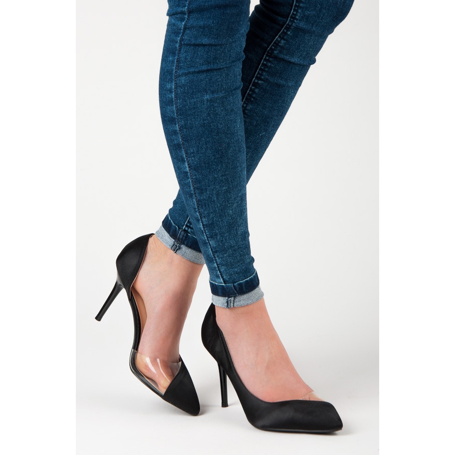 Entdecken Sie einen einzigartigen Stil mit satintransparenten schwarzen High Heels. Diese eleganten Schuhe mit hohen Absätzen vereinen klassisches mit modernem Design und ziehen mit einem einzigartigen transparenten Element an der Spitze alle Blicke auf sich. Sie sehen aus, als wären sie halb angeschnitten, was ihnen Originalität verleiht und jedem Benutzer das Gefühl gibt, etwas Besonderes zu sein.