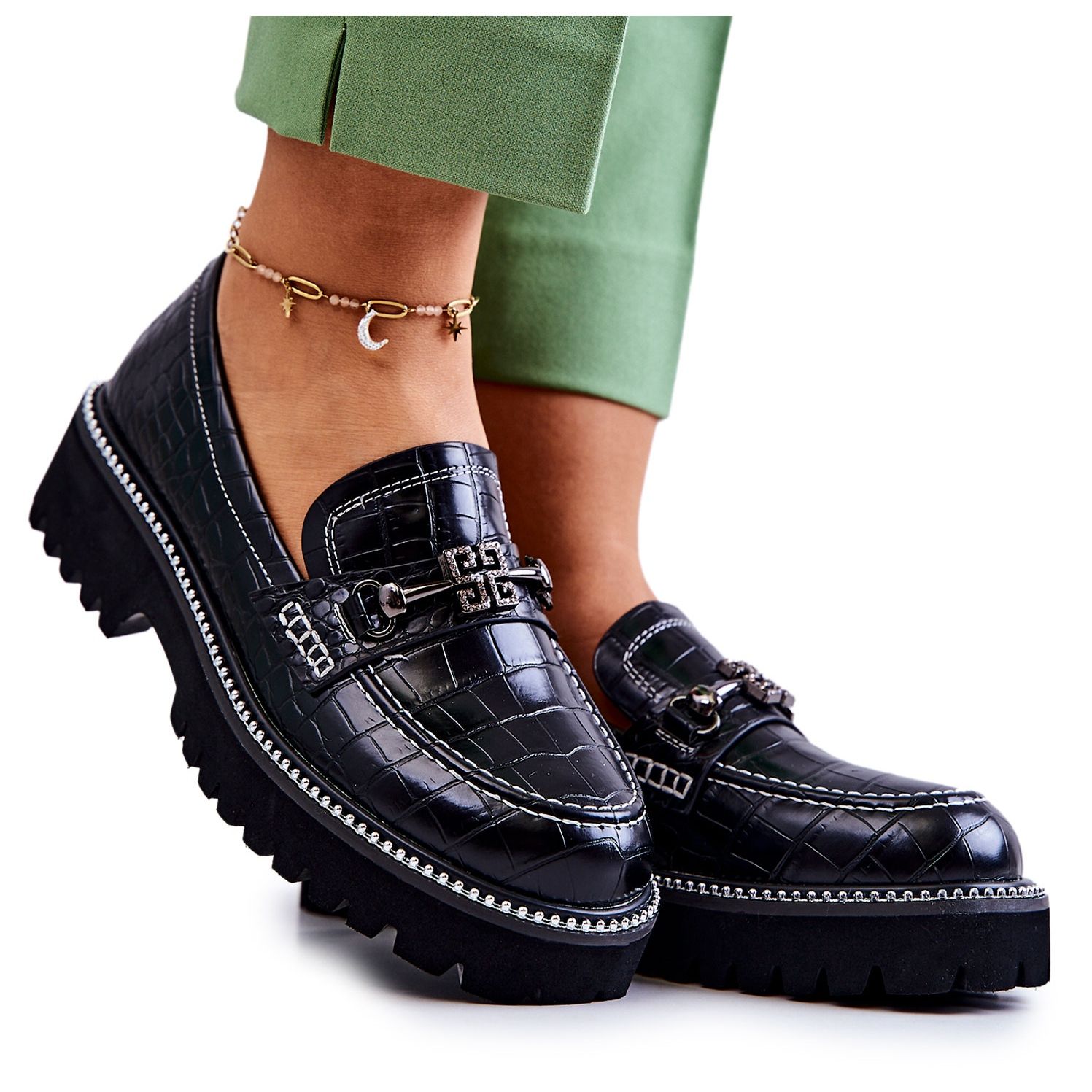 Ein interessanter Akzent ist der Riemen auf der Vorderseite mit dekorativem Element, der diesen Schuhen einen einzigartigen Charakter verleiht. Dank eines flachen 4 cm hohen Absatzes und einer soliden Sohle mit großer Profilfläche (2,5 cm) fühlen Sie sich bei jedem Schritt sicher und sicher. Eine bequeme Innensohle aus Naturleder sorgt dafür, dass sich diese Schuhe perfekt an den Fuß anpassen und den ganzen Tag über ein angenehmes Tragegefühl gewährleisten.