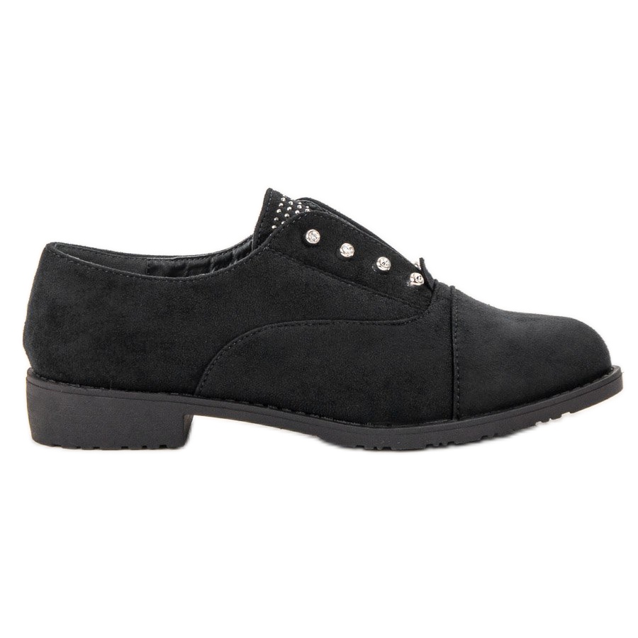 Die Schuhe zeichnen sich durch einen flachen 3 cm hohen Absatz und einen eingearbeiteten, weichen Absatz aus, der den ganzen Tag über ein angenehmes Tragegefühl gewährleistet. Sie bestechen zusätzlich durch zarte Strasssteine und Strasssteine, die sie zu einer perfekten Ergänzung für das Alltags-Styling machen. Dank der schwarzen Farbe und dem klassischen, lässigen Stil können Sie sie problemlos zu verschiedenen Outfits kombinieren, unabhängig vom Anlass.