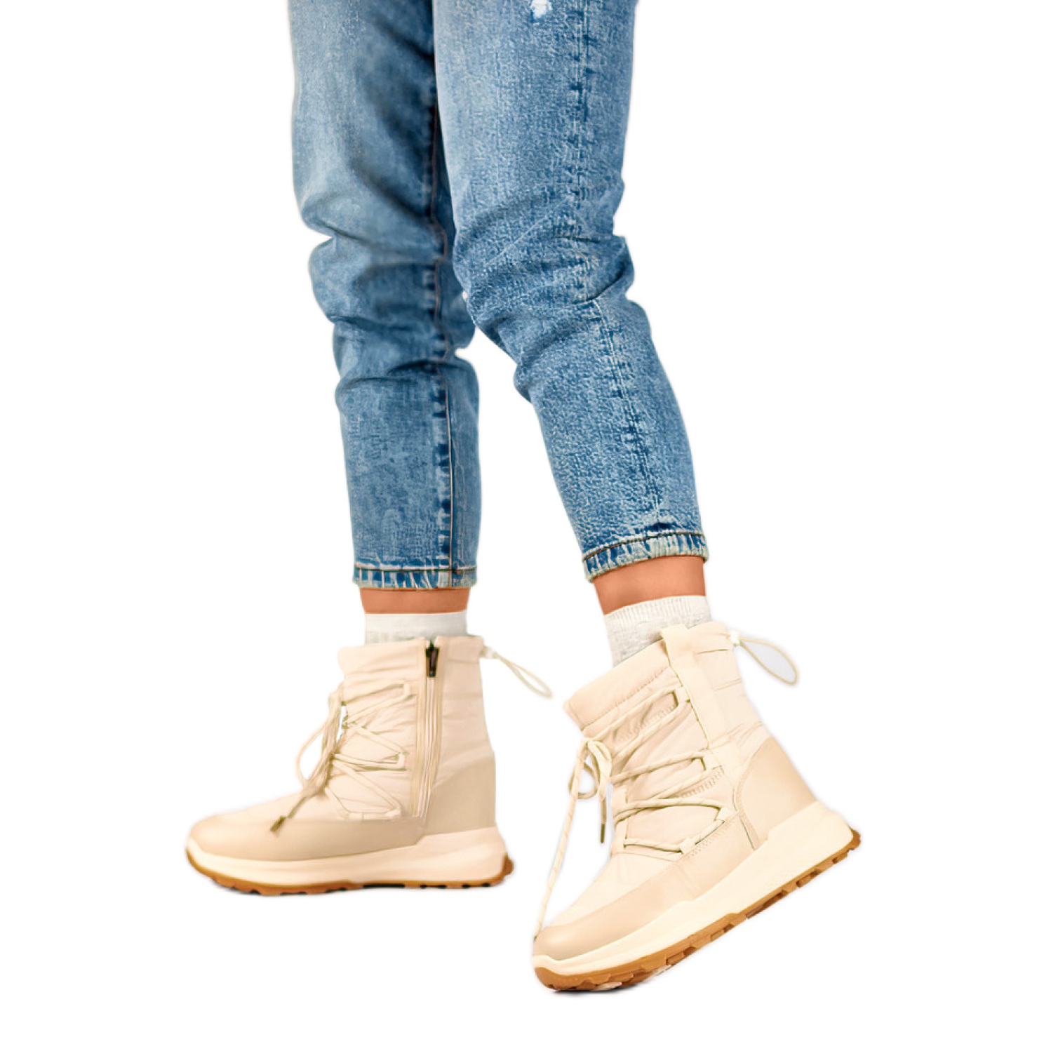 Dank einer komfortablen 4 cm hohen Plattform garantieren diese Schneestiefel beim Gehen Stabilität und ihr Design schützt vor Feuchtigkeit. Die Kaste des Reißverschlusses und zusätzliche Schnürung machen Sie perfekt zu den Schuhen mit der Form des Fußes, was die volle Bewegungsfreiheit gewährleistet. Die klassische runde Nase verleiht Eleganz, und die beige Farbe lässt die Schuhe leicht mit verschiedenen Stilisierungen kombinieren.