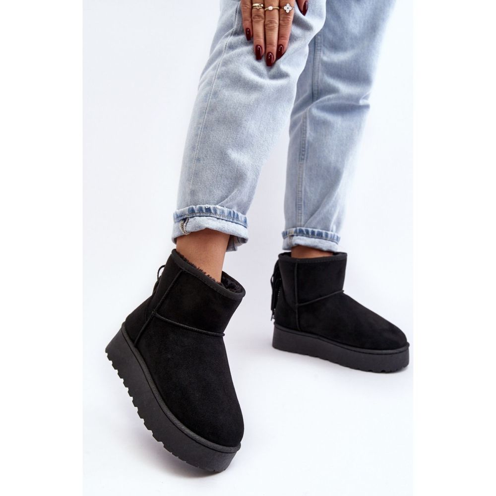 Das obere Knöchel, das mit modischen Fransen dekoriert ist, verleiht ihnen einen einzigartigen Charakter. Dank einer soliden Plattform 4 cm hoch ist es nicht nur bequem, sondern auch stabil. Das Innere der Schuhe ist mit dickem Fell isoliert, was auch an den kältesten Tagen die Hitze sorgt.