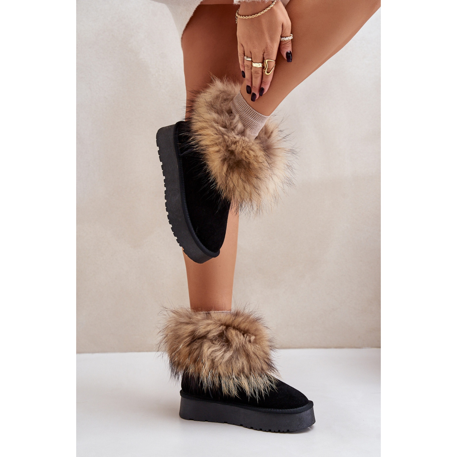 Der obere Teil des Oberen ist mit einem flauschigen Fell dekoriert, was nicht nur einen Charme, sondern auch zusätzliche Wärme verleiht, was sie zu einem unersetzlichen Element der Wintergarderobe macht. Schneestiefel sind auf einer stabilen Plattform mit einer Höhe von 3,5 cm eingebettet, was sie auch bei längeren Spaziergängen bequem macht.
