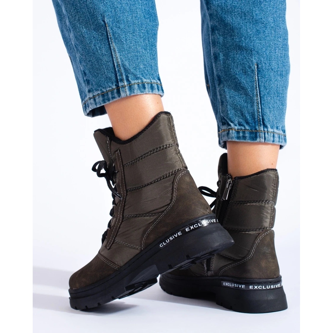 Stylische und bequeme Schneestiefel für Frauen in einer modischen grünen Farbe - perfekt für kühlere Tage. Die Kombination aus ökologischen Wildleder und ökologischen Hautelementen garantiert ein elegantes Aussehen mit einer ökologischen Herangehensweise an Materialien. Die Erwärmung und eine Textileinholde sorgen für den thermischen Komfort, und eine solide synthetische Sohle mit Profil verleiht schneebedeckte und feuchte Oberflächen eine gute Haftung.