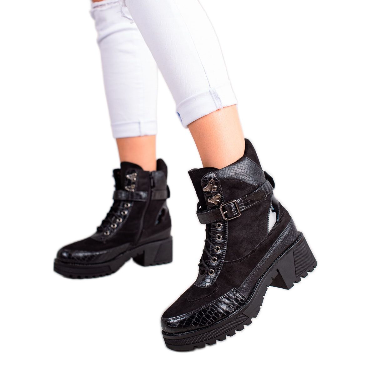 Der eingearbeitete, weiche Absatz sorgt für Tragekomfort und die Isolierung macht sie perfekt für kalte Tage. Dank eines 2,5 cm hohen Plateaus und eines flachen Absatzes (5 cm) sind diese Stiefeletten äußerst bequem für den täglichen Gebrauch, sowohl im Trubel der Stadt als auch bei Spaziergängen. Lässiger Stil kombiniert mit einem Rock-Akzent verleiht jedem Styling Charakter.