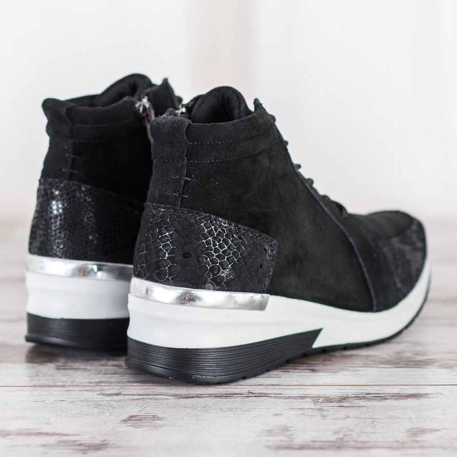 Durch die Schnürung und den Reißverschluss schmiegen sich die Stiefel perfekt an das Bein an und ihr erhöhter und weicher Absatz unterstreicht die Ästhetik des Ganzen. Darüber hinaus benötigt dieses Modell keine Isolierung, was es zu einer idealen Wahl für die Übergangszeit macht. Ohne Muster, in klassischen schwarzen Farben werden diese Stiefeletten mit Sicherheit zu einem universellen Element Ihrer Garderobe.