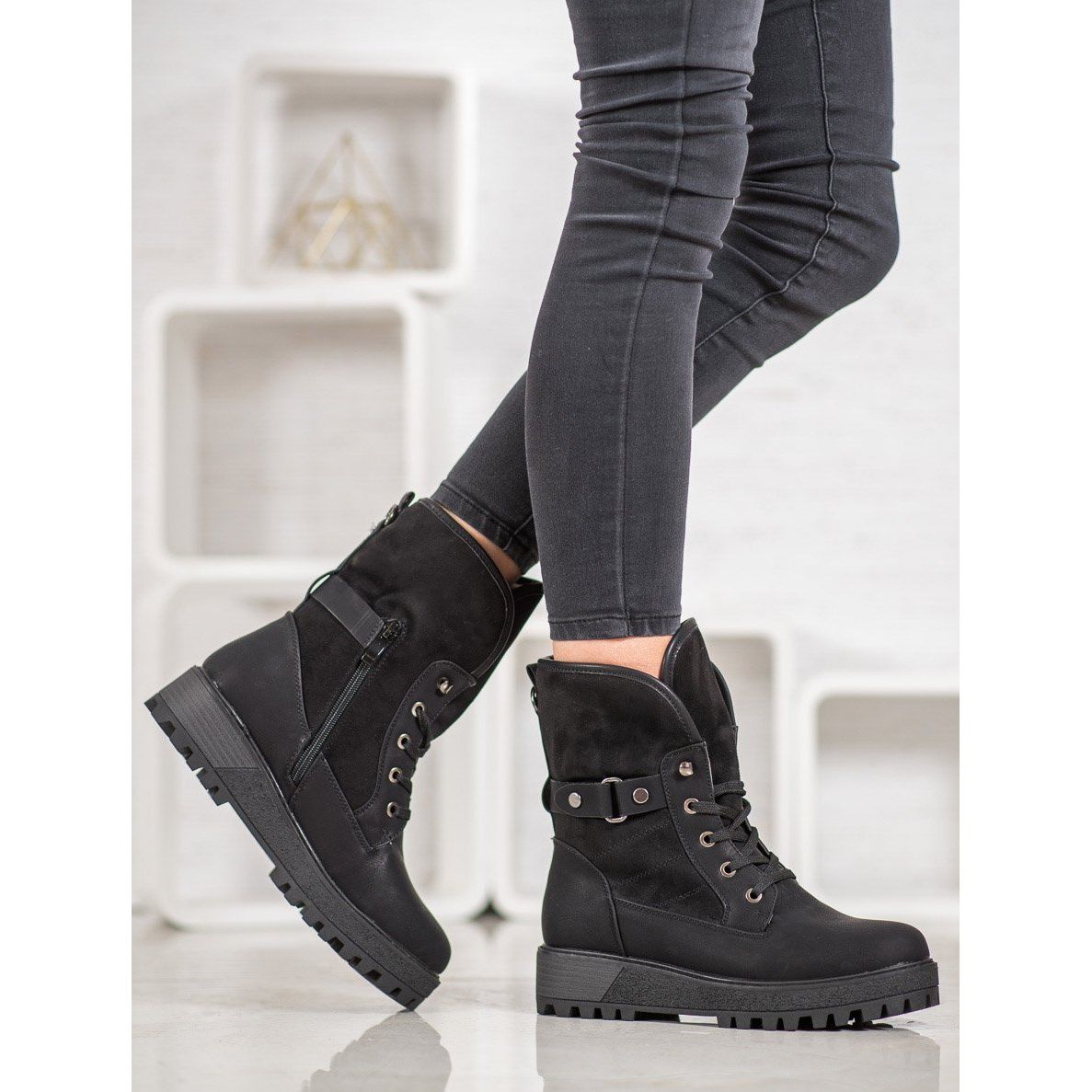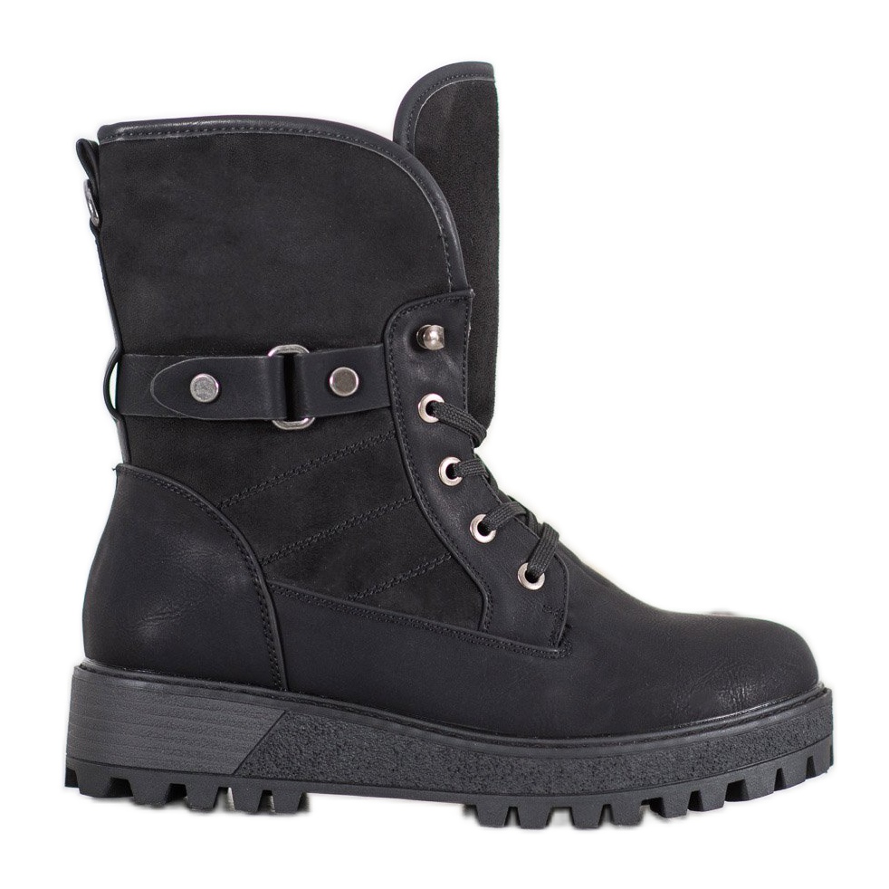 Entdecken Sie Eleganz und Komfort mit den SHELOVET Schnürstiefeln mit Schaffellmantel in Schwarz. Diese stilvollen Damenschuhe werden nicht nur zu einem modischen Element Ihrer Garderobe, sondern dank ihrer isolierten Innenseite auch eine ideale Wahl für kältere Tage. Sie bestehen aus hochwertigem ökologischem Leder und bieten hervorragende Haltbarkeit und Tragekomfort.