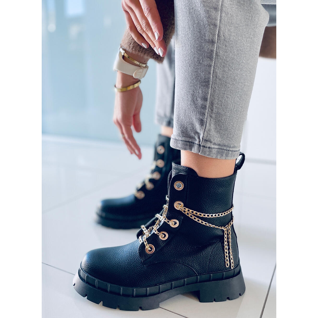 Lohan Black Schnürstiefeletten sind ein Must-Have in der Garderobe jeder Frau! Diese auffälligen schwarzen Stiefel zeichnen sich durch ein originelles Design aus, das Komfort mit Mode verbindet. Anstelle der traditionellen Schnürung ist dieses Modell mit einer stilvollen Goldkette ausgestattet, die ihm einen einzigartigen Charakter verleiht. Im Set sind außerdem austauschbare Schnürsenkel enthalten, mit denen Sie den Look der Schuhe individuell gestalten können.