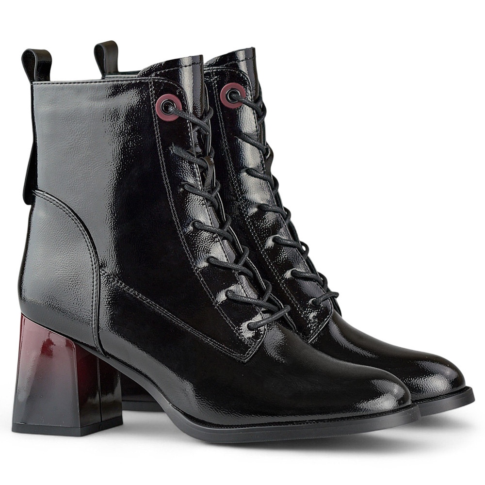 Die elegante Lace -up -Frauen, die in Schwarz lackiert ist, ist eine gute Wahl für Frauen, die Stil und Komfort schätzen. Bei der Aufführung dieser Stiefel wurde ökologisches Leder mit hohem Qualitätsleder verwendet, das nicht nur elegant aussieht, sondern auch leicht zu reinigen ist. Dieses Modell zeichnet sich durch eine runde Nase und eine klassische Ferse in Form eines 7 cm hohen Pfostens aus, was ihnen Stil und Stabilität verleiht.